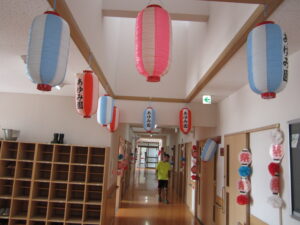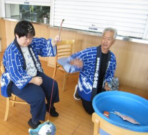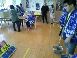 前日に職員が飾り付けをして、当日は揃いのはっぴを着て楽しみました!