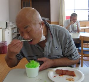 お昼にハンバーグ弁当を、おやつにかき氷とフランクフルトをいただきました。