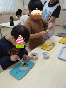 シロップやチョコなどあま~いソースをせんべいいっぱいに塗る人もいれば、遠慮がちに
